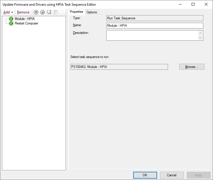 Task Sequence: I previously had the reboot included as the last step of the HPIA module. I decided to move that to the actual OSD/IPU task sequence, as I want the user self service method to warn the end user for a few minutes rather than instantly rebooting at the conclusion of the task sequence. I also wanted a more user friendly title for the task sequence that will appear in the software center. This is accomplished by nesting the same HPIA module I use in OSD/IPU task sequences, followed by a reboot.